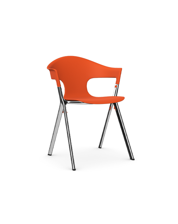 The Axyl chair with Plastic shell with aluminum powder coat frame stacks four high to enable easy storage.
