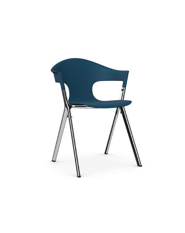 The Axyl chair with Plastic shell with aluminum powder coat frame stacks four high to enable easy storage.