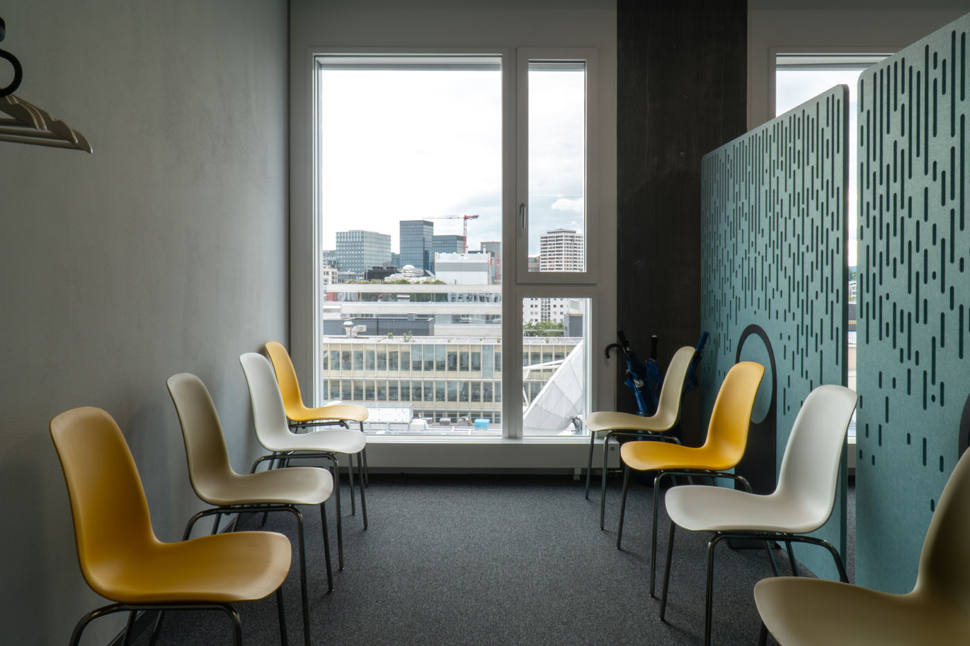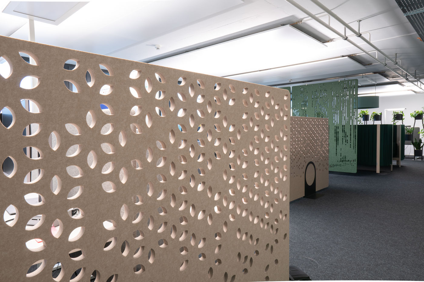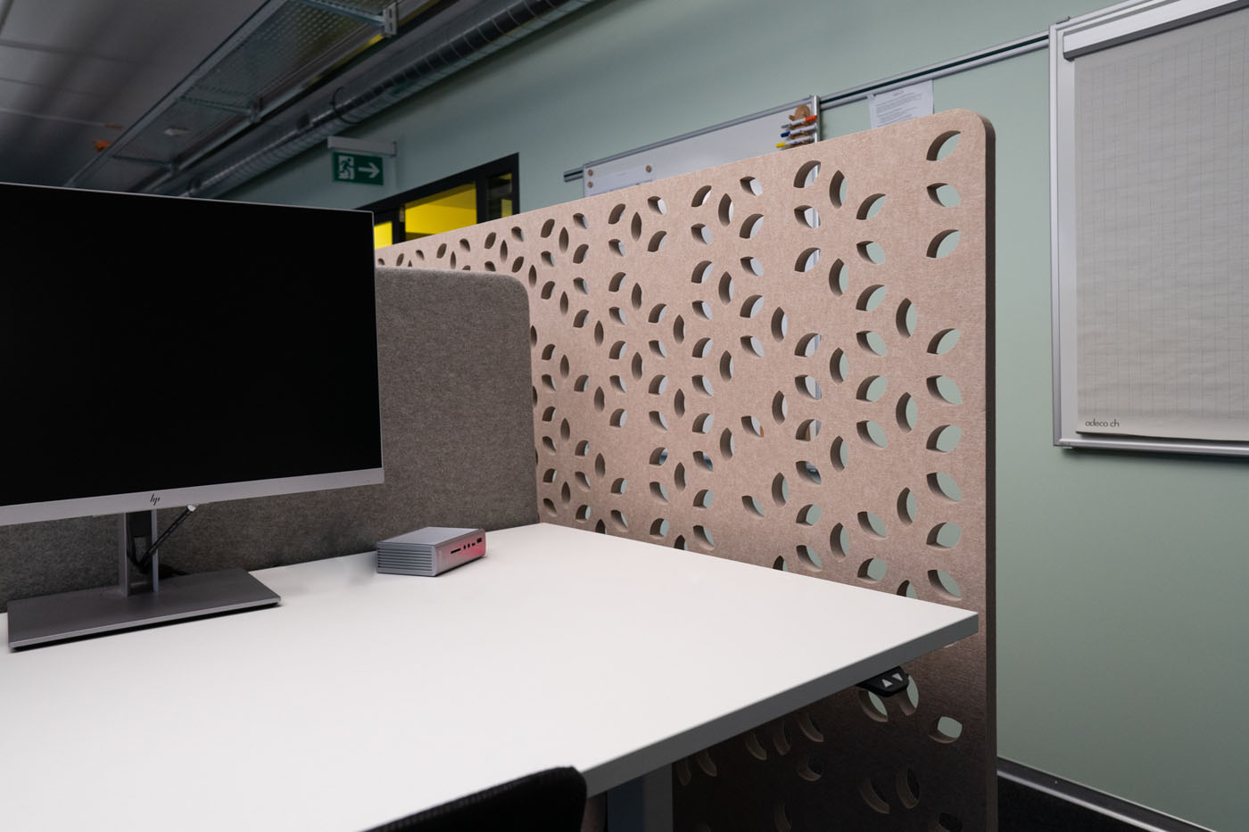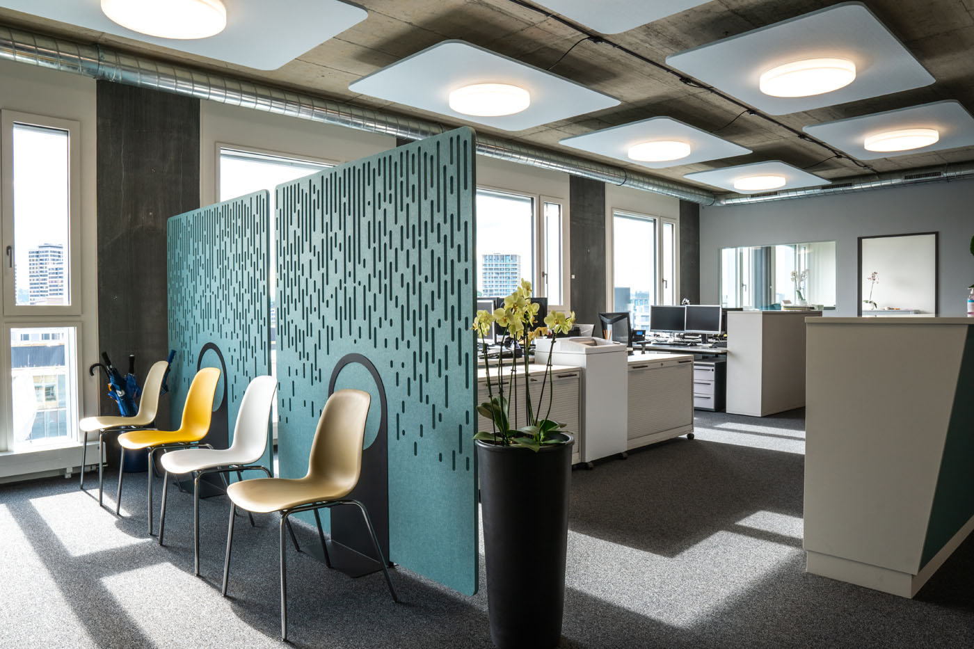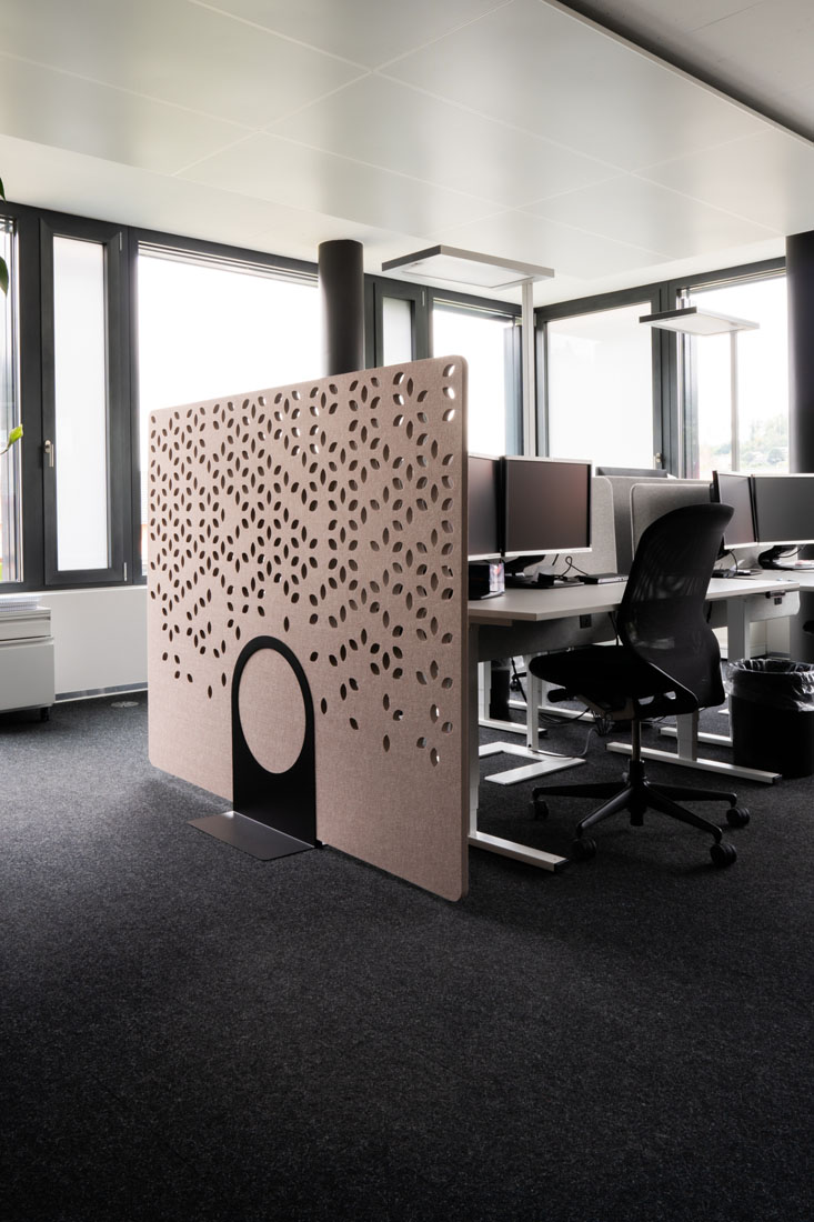 The acoustic room divider impresses with its elegance and simplicity. The highly compressed material is inserted into the steel base without tools. With 4 designs and 6 size options, Asto is the perfect free standing space divider.