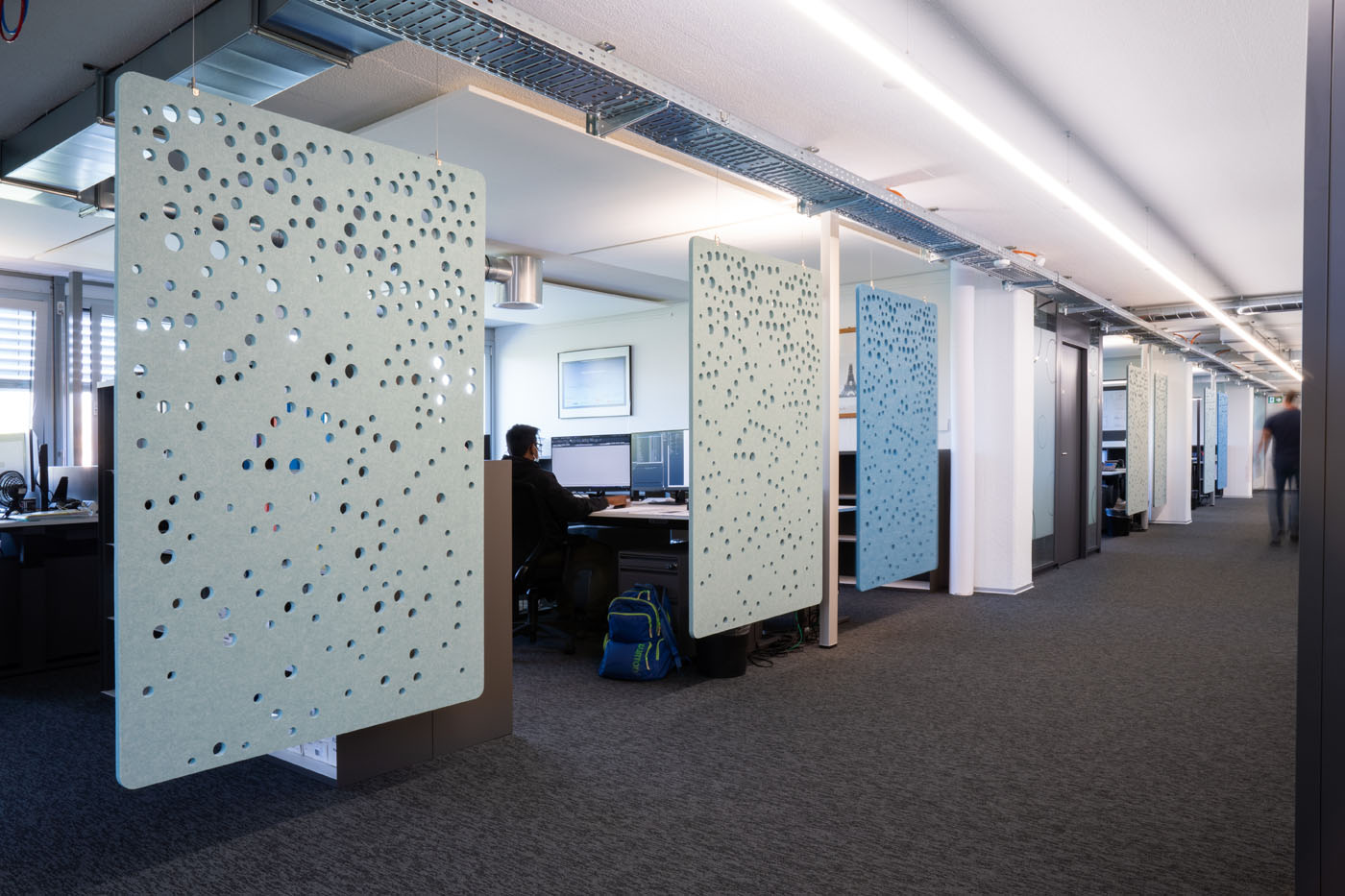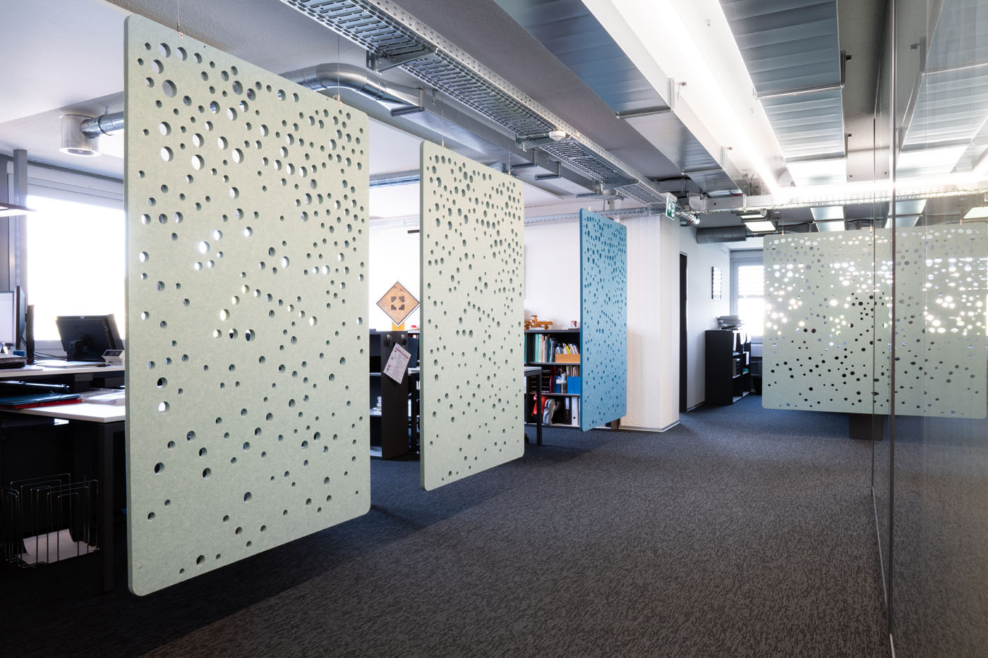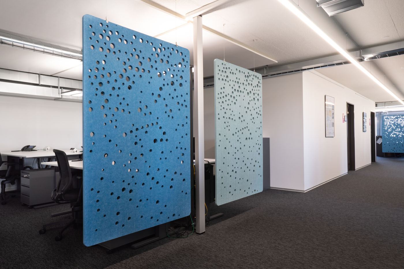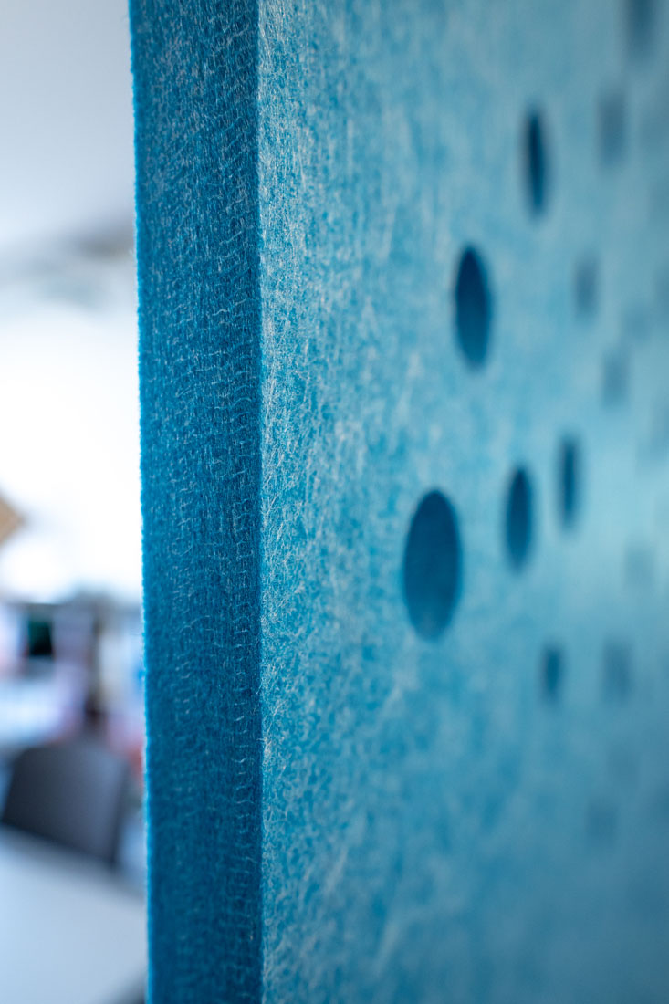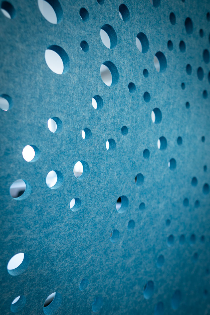 Circular-shaped bubble perforations, created by computational-aided design, beautifully spread across this sound-absorbing screen. Use it to define smaller areas in bigger spaces while optimising visual and acoustic privacy.