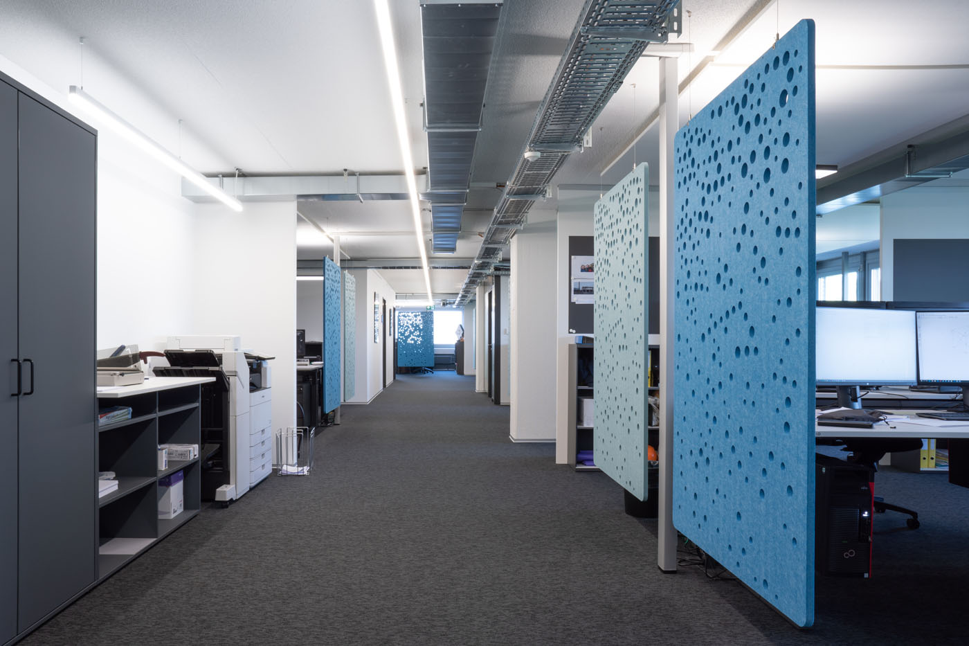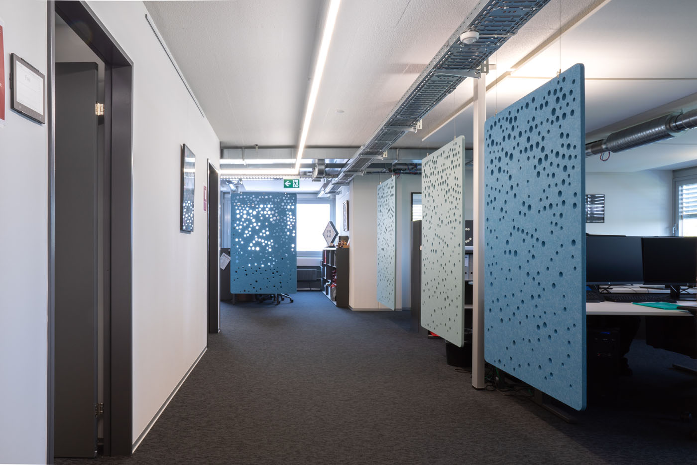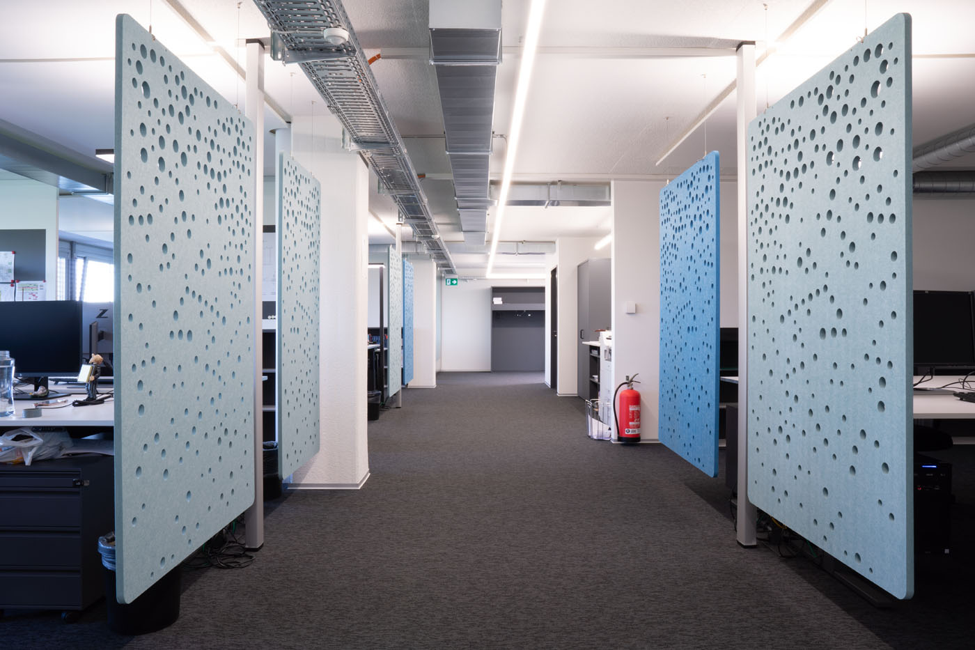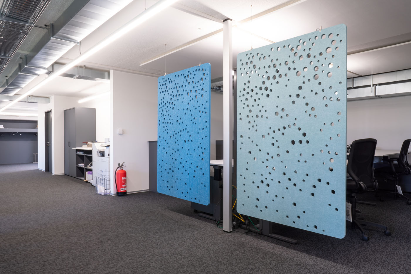 Circular-shaped bubble perforations, created by computational-aided design, beautifully spread across this sound-absorbing screen. Use it to define smaller areas in bigger spaces while optimising visual and acoustic privacy.