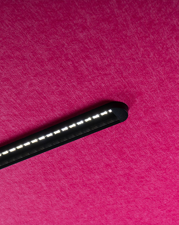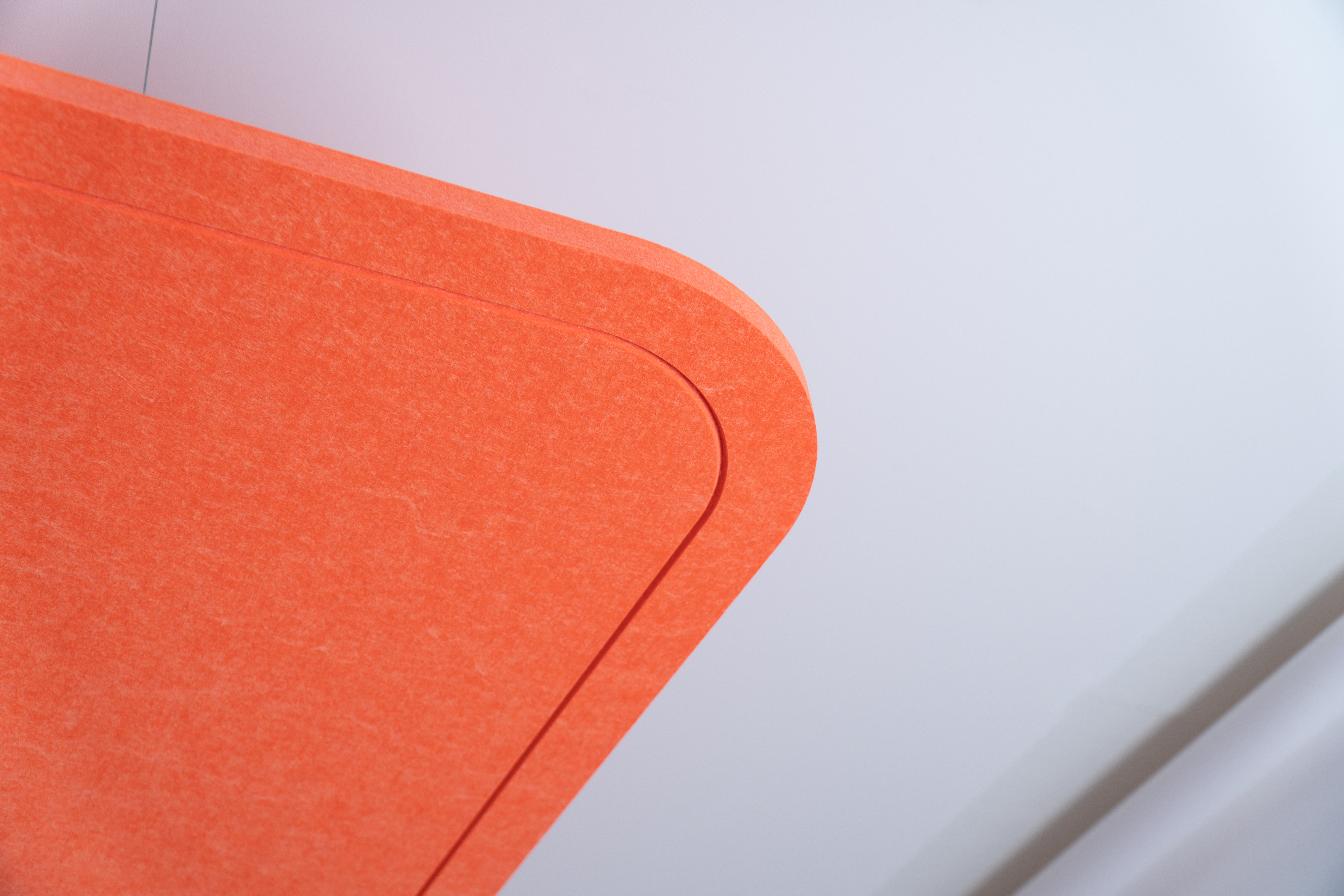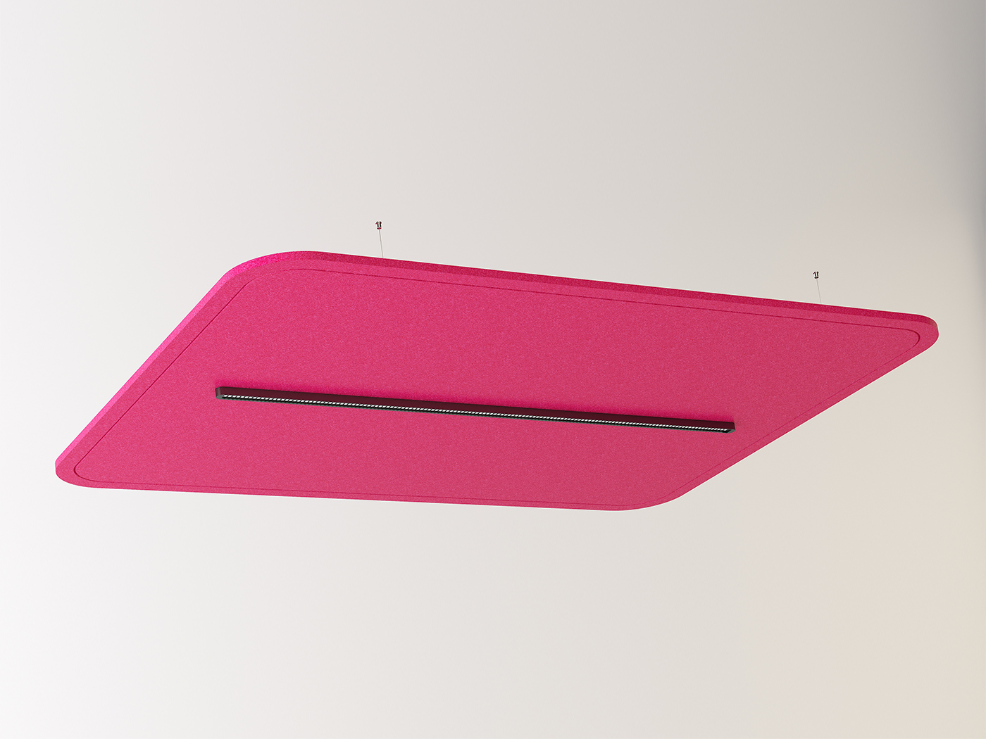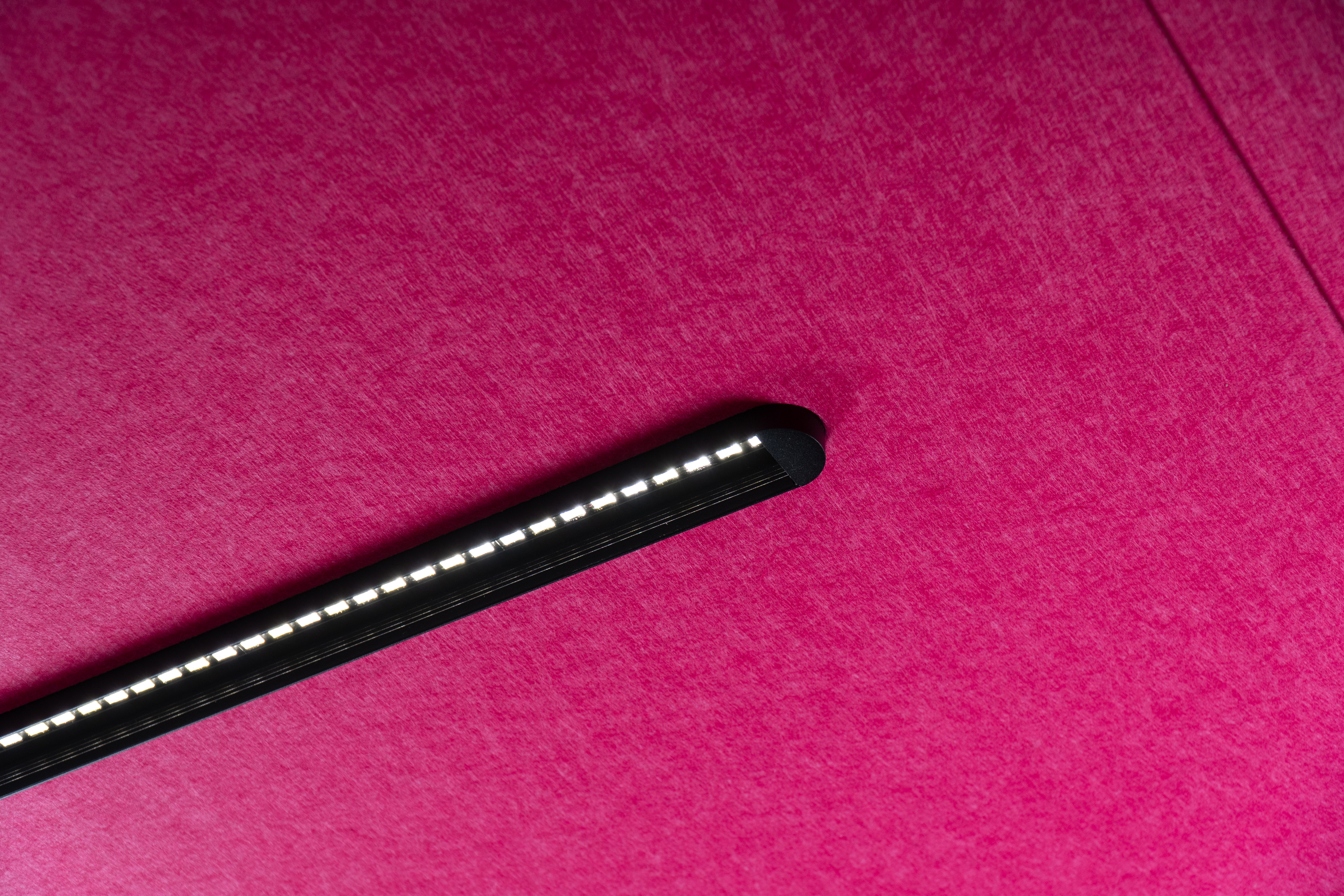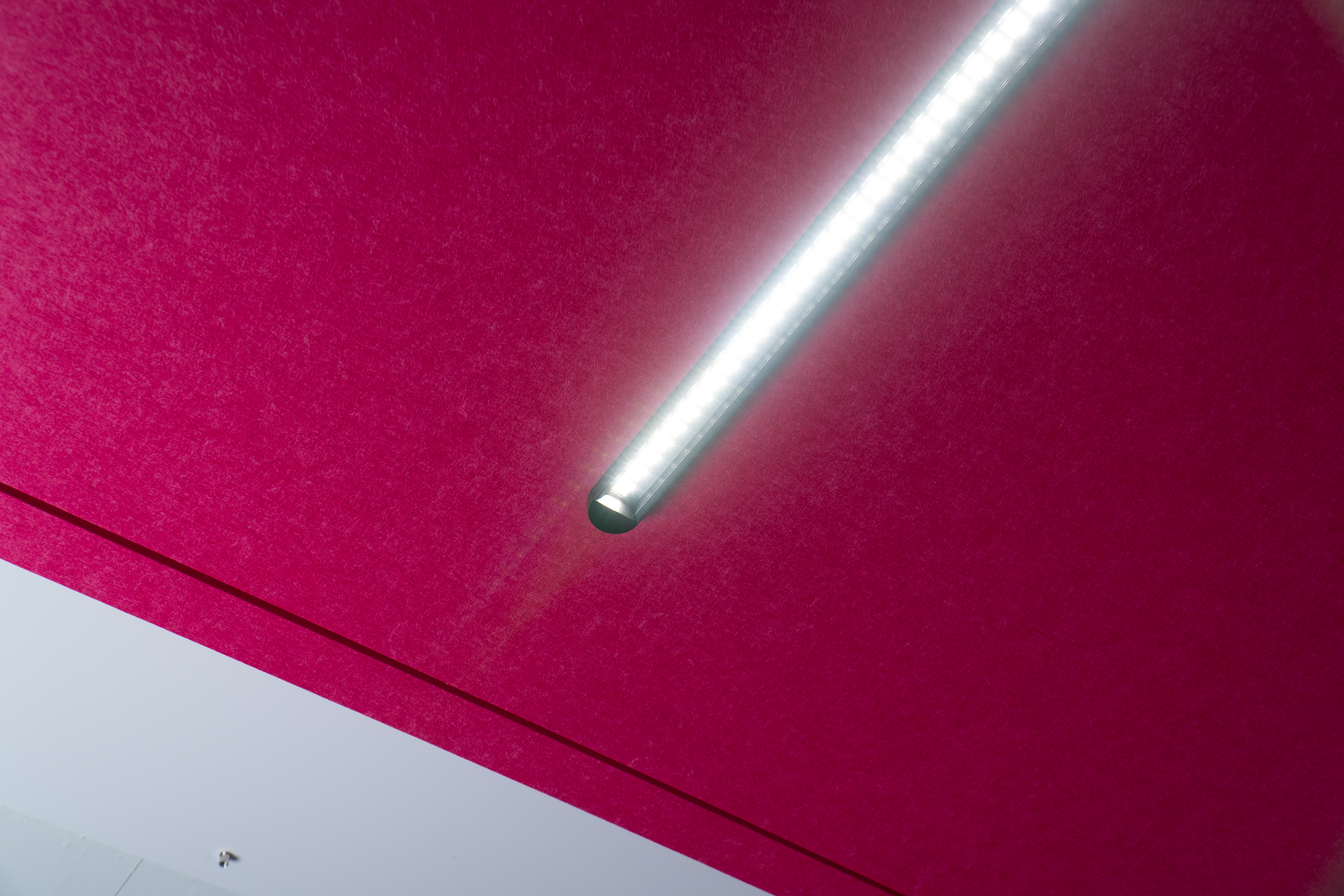 Amazing, how the light can be focused and directed in a targeted manner using the reflectors, thus guaranteeing the best illumination of workplaces. The processing of the recessed light sources ensures that the light in the acoustic panel almost disappears. The rounded corners of the floating sail create a secure feeling of space.