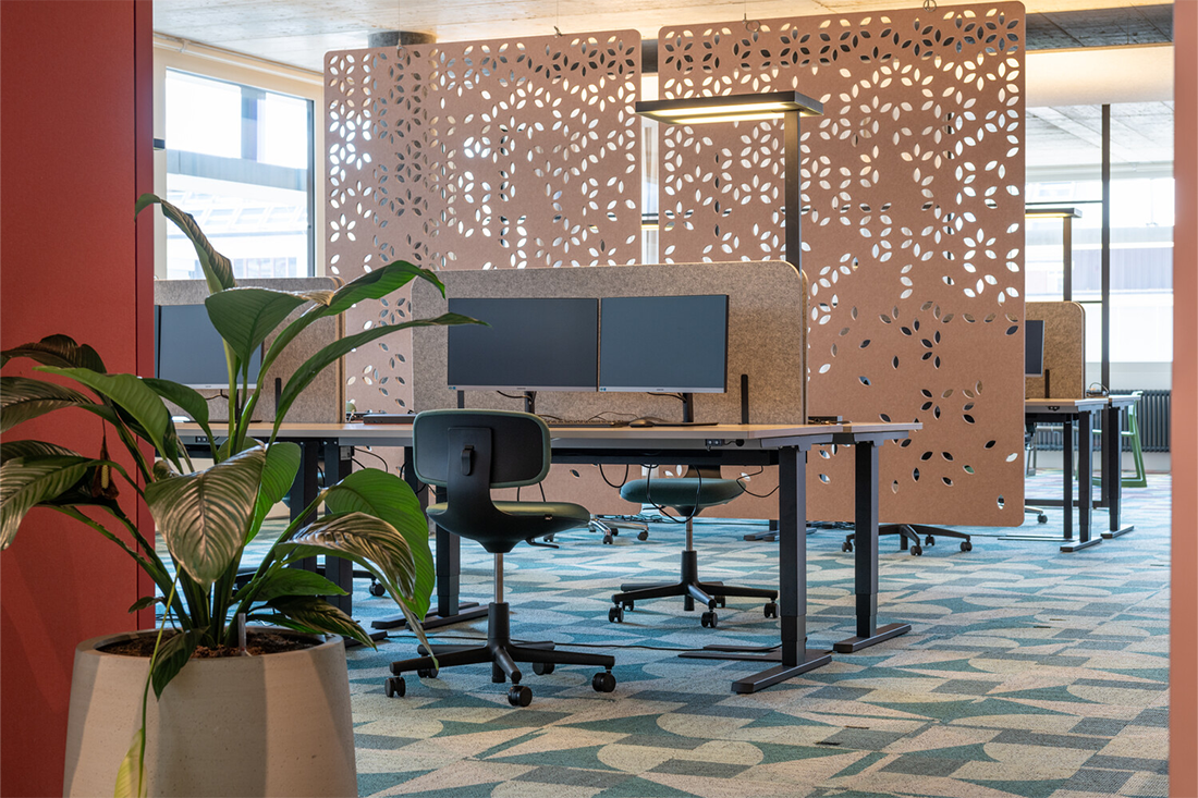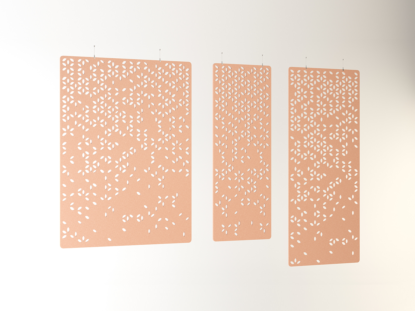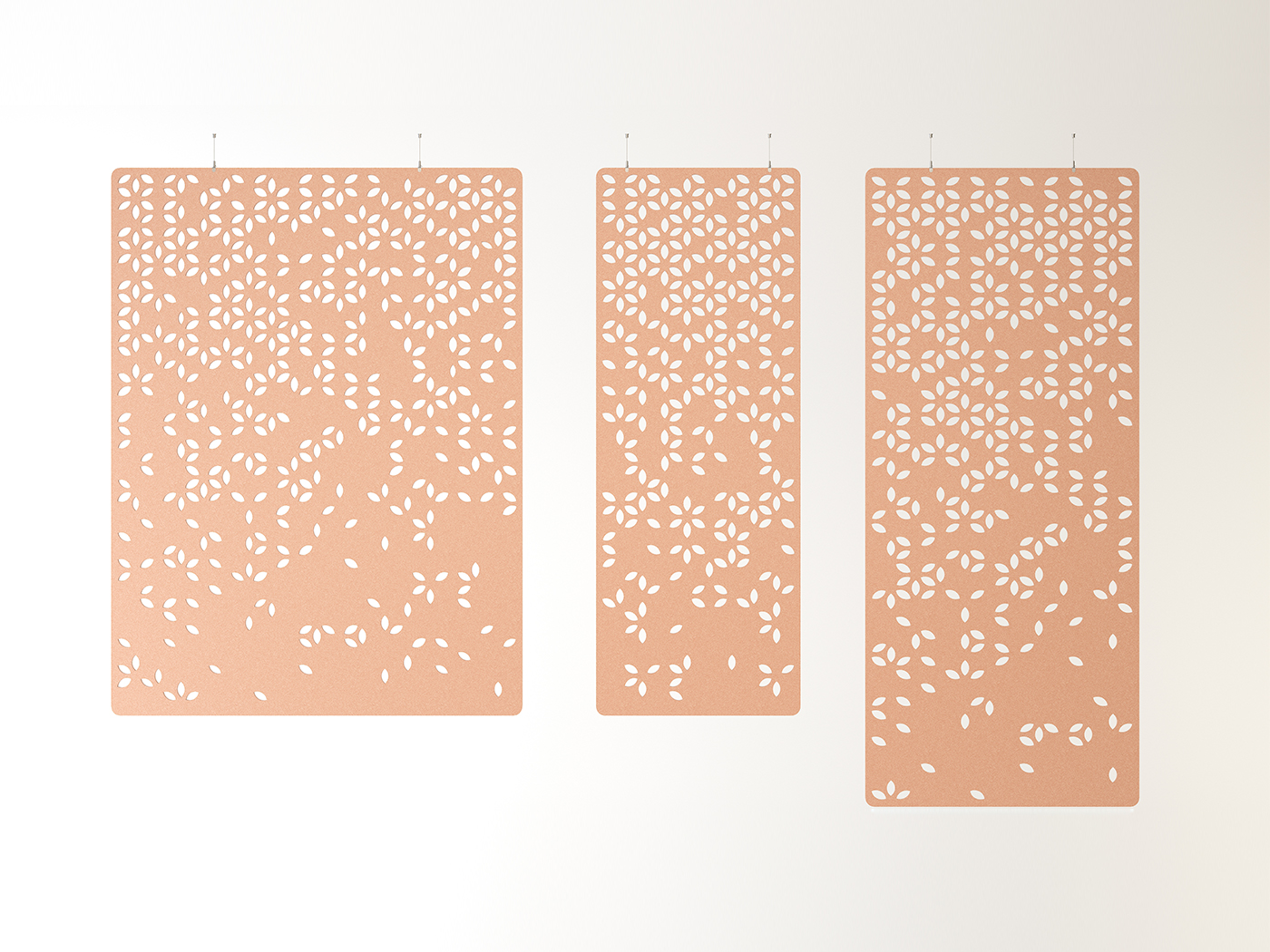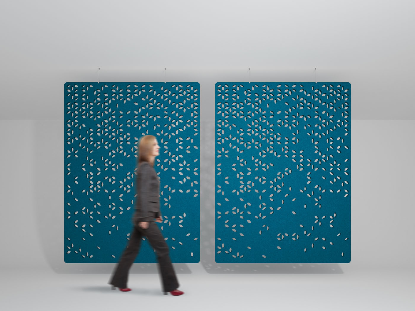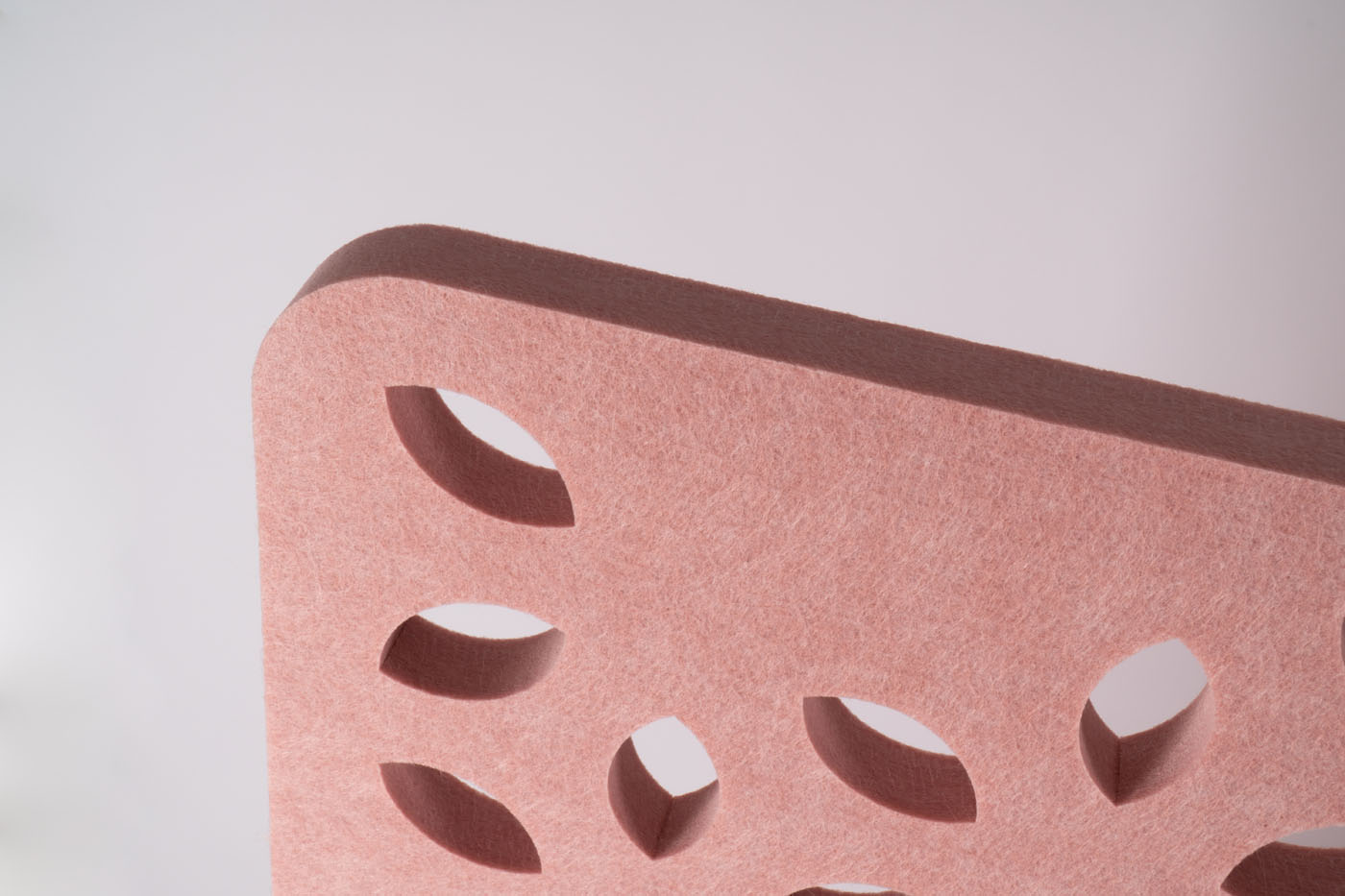 The harmonious distribution of the triangular perforations of this acoustic room divider is based on the Delaunay triangulation. Points are cross-linked to triangles so that no other points are contained within the circle on which the three triangle points lie (circumference of the triangle). This principle can be found everywhere in nature and has a calming effect on humans because it is subject to a clear rule.
