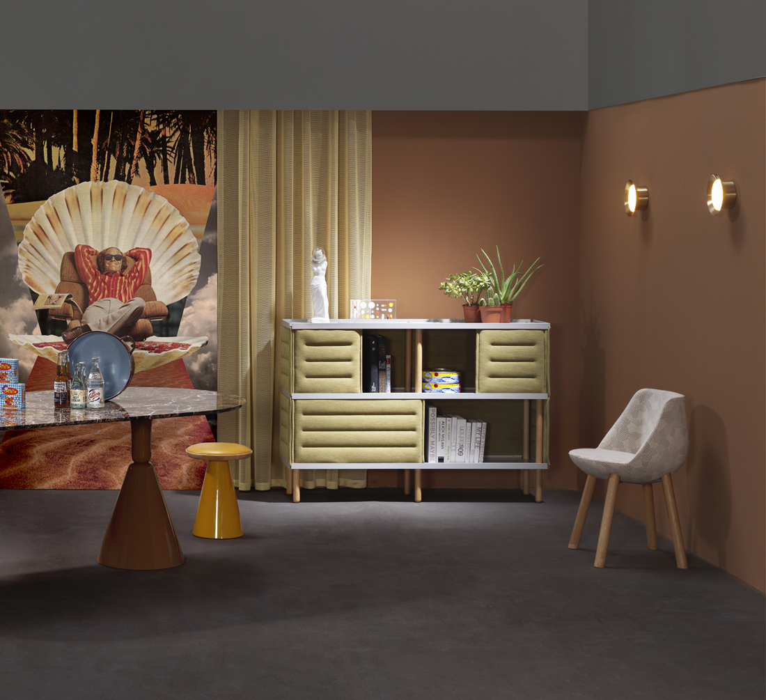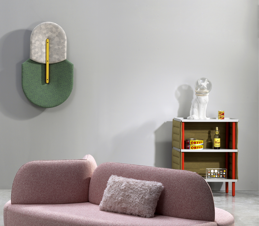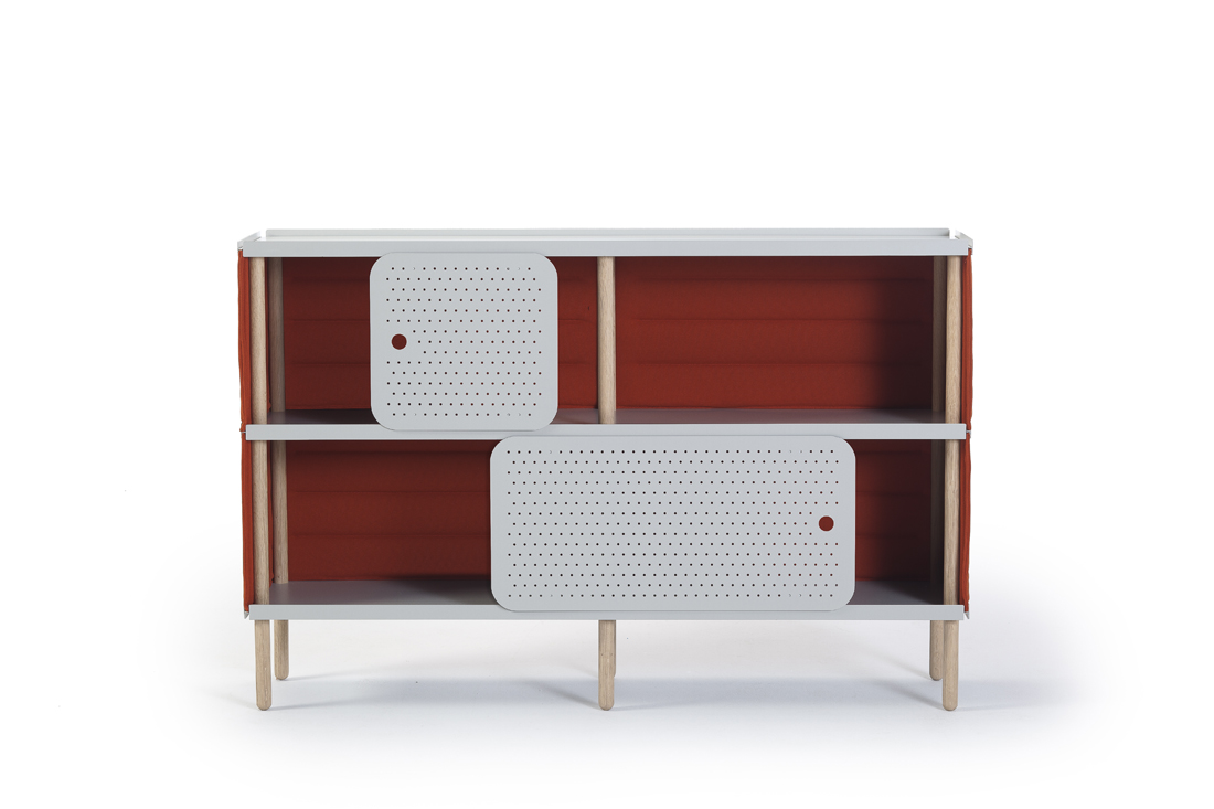 Oak, fabric and aluminium play quietly together! Estante is a versatile and cheerful piece of furniture with acoustic properties. The highly configurable design transcends its storage function as it can be used as sideboard, bookcase, television stand or a space divider.