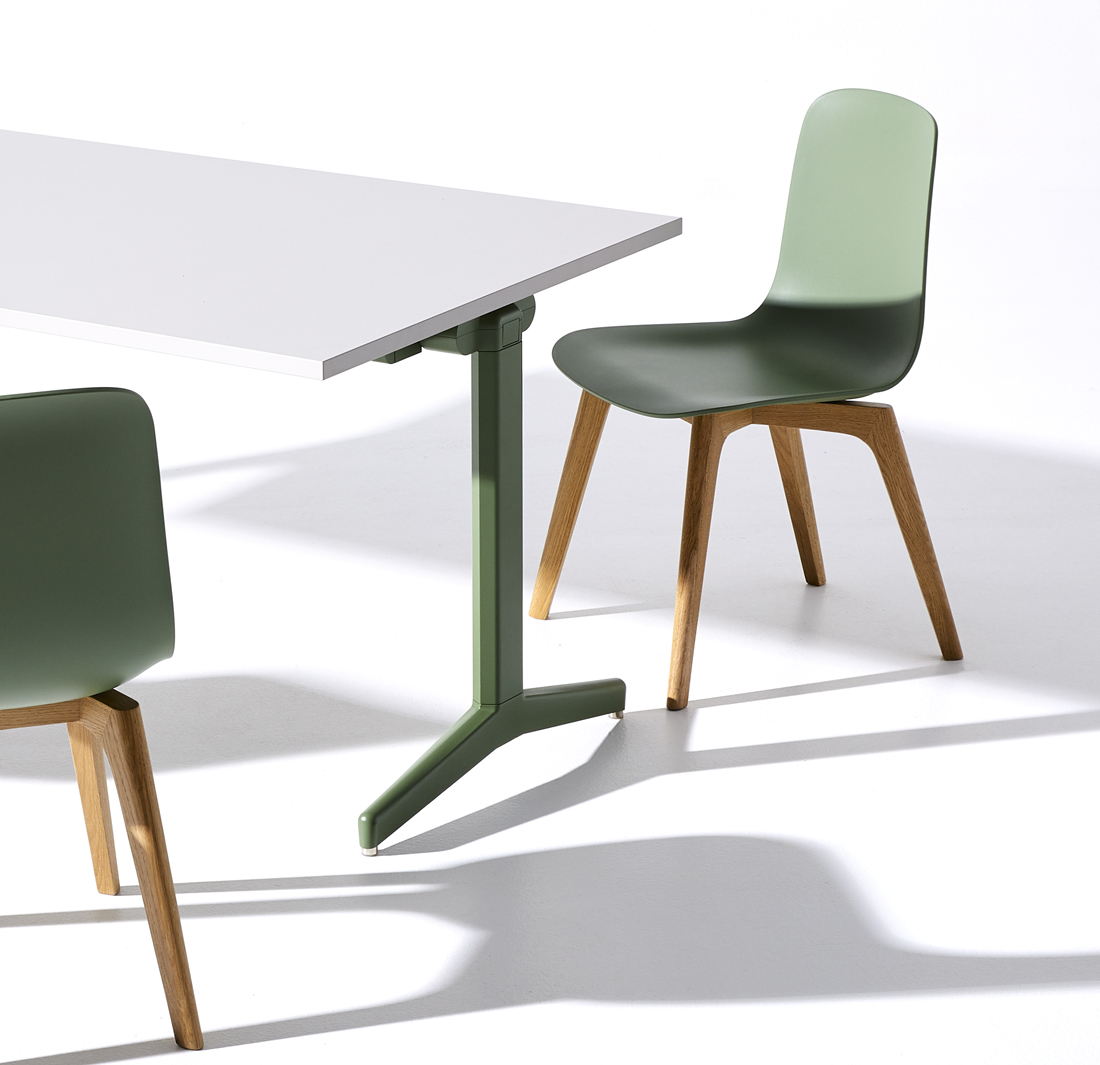 Kissen conference is a range of seating or standing height fixed tables, available in rectangular, square or round worktops. The leg comes with table reticulation through the leg and various cable duct options, all with inset GPO holders.