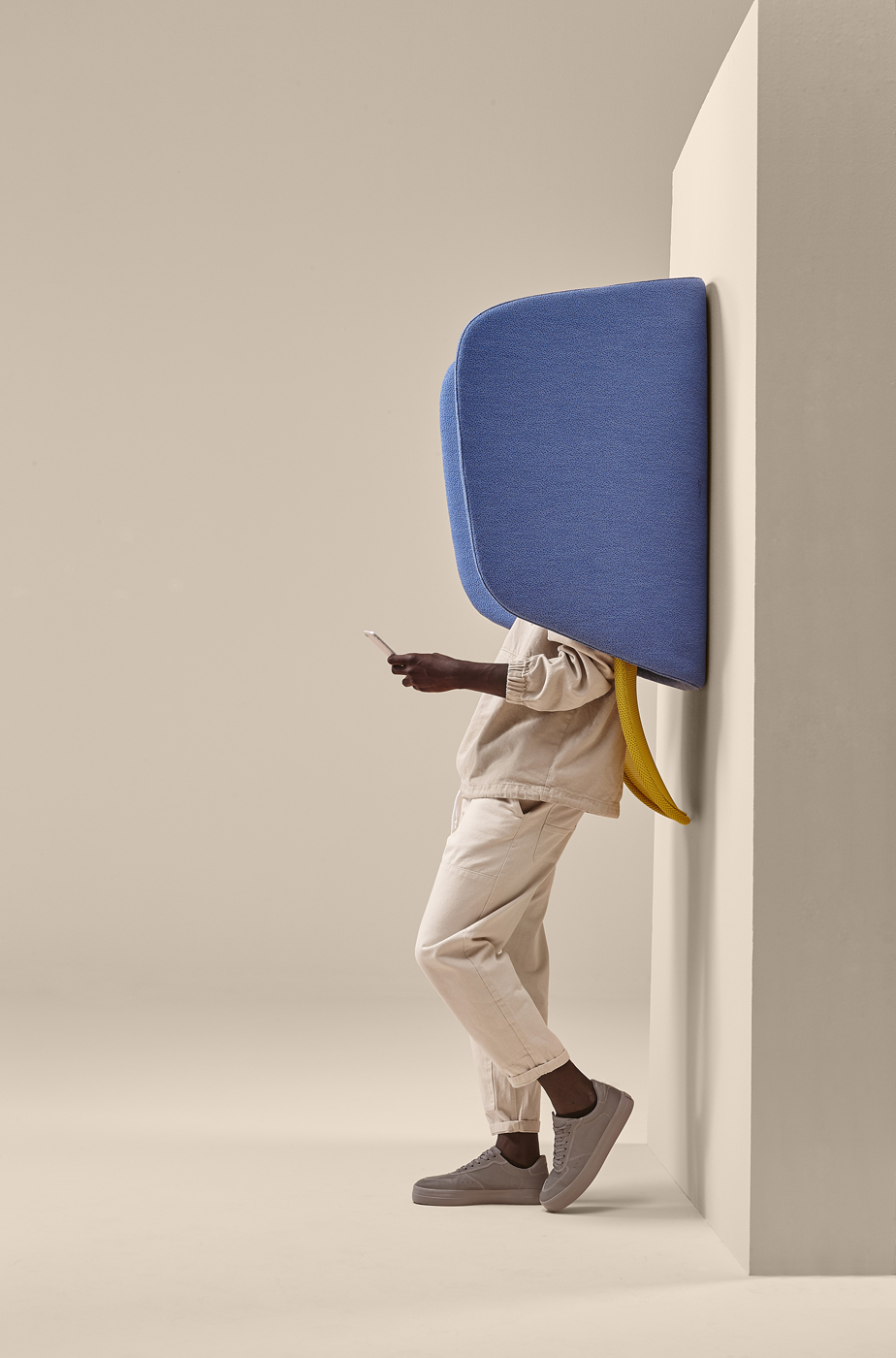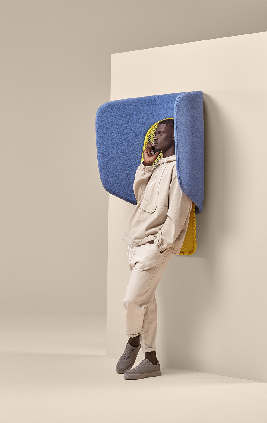 The “hood” contributes to improve acoustics thanks to its curved upholstered panels. The shape reflects sound back to the person making a call, causing them to naturally lower their voice, while the padded upholstery helps to dampen the room’s reverberation.