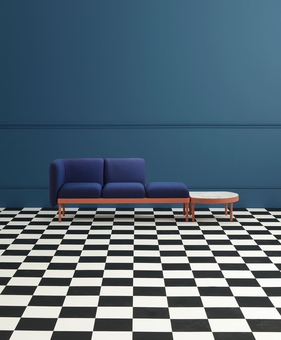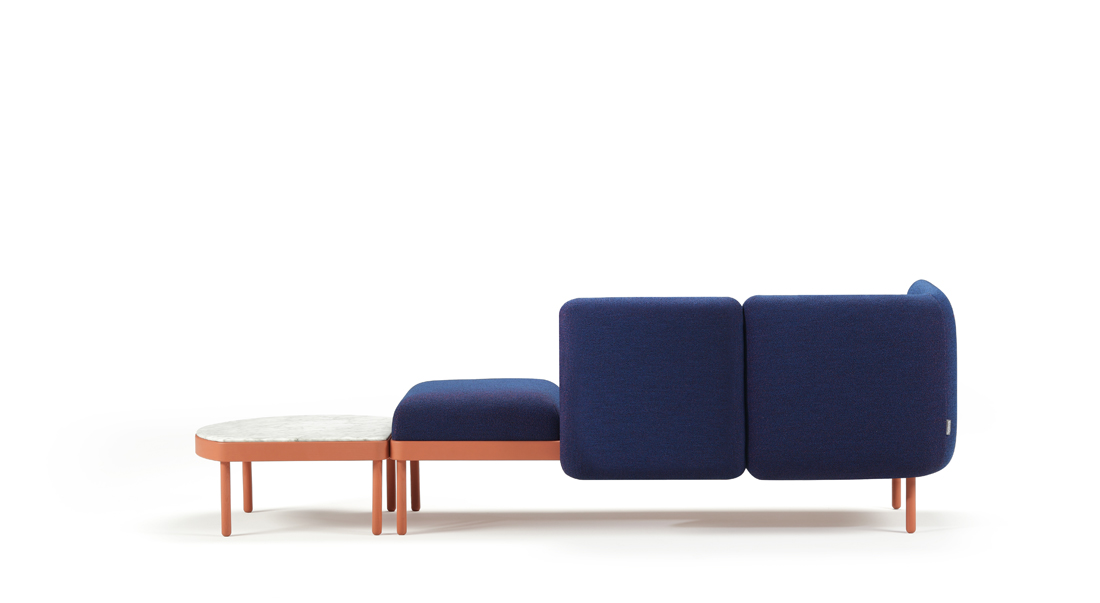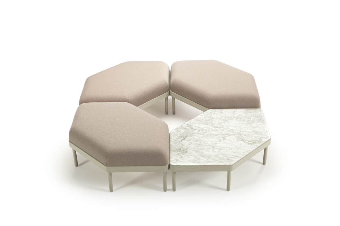 Mosaico is a puzzle that can be used to solve a range of different spatial constraints. The timber base is available in five measurements upon which marble and wooden tops can be fitted, as well as upholstery. The optional backs enable, amongst the possibilities, the creation of compositions that make closed loops. These facet shaped forms pay homage to the ceramic tiled city of Valencia, Spain.
