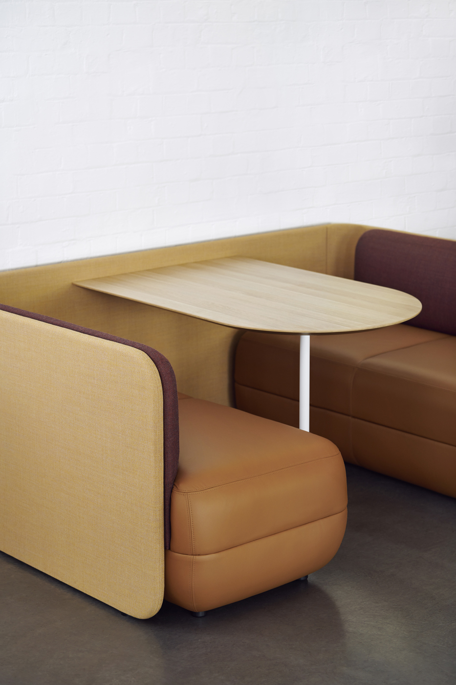 Precinct Meet Booth provides a room within the room. Available in both low and high screen encasings, the Meet Booth caters to the full spectrum of workplace modalities. The low screen option builds a room for informal catch-ups with colleagues and vibrant collaboration. High screen creates an enclave within the bustling workspace for focused work and private group work. The D-shaped centre table, designed with the aesthetic capacity to act as both a casual café table or a work desk, includes table-top power options.