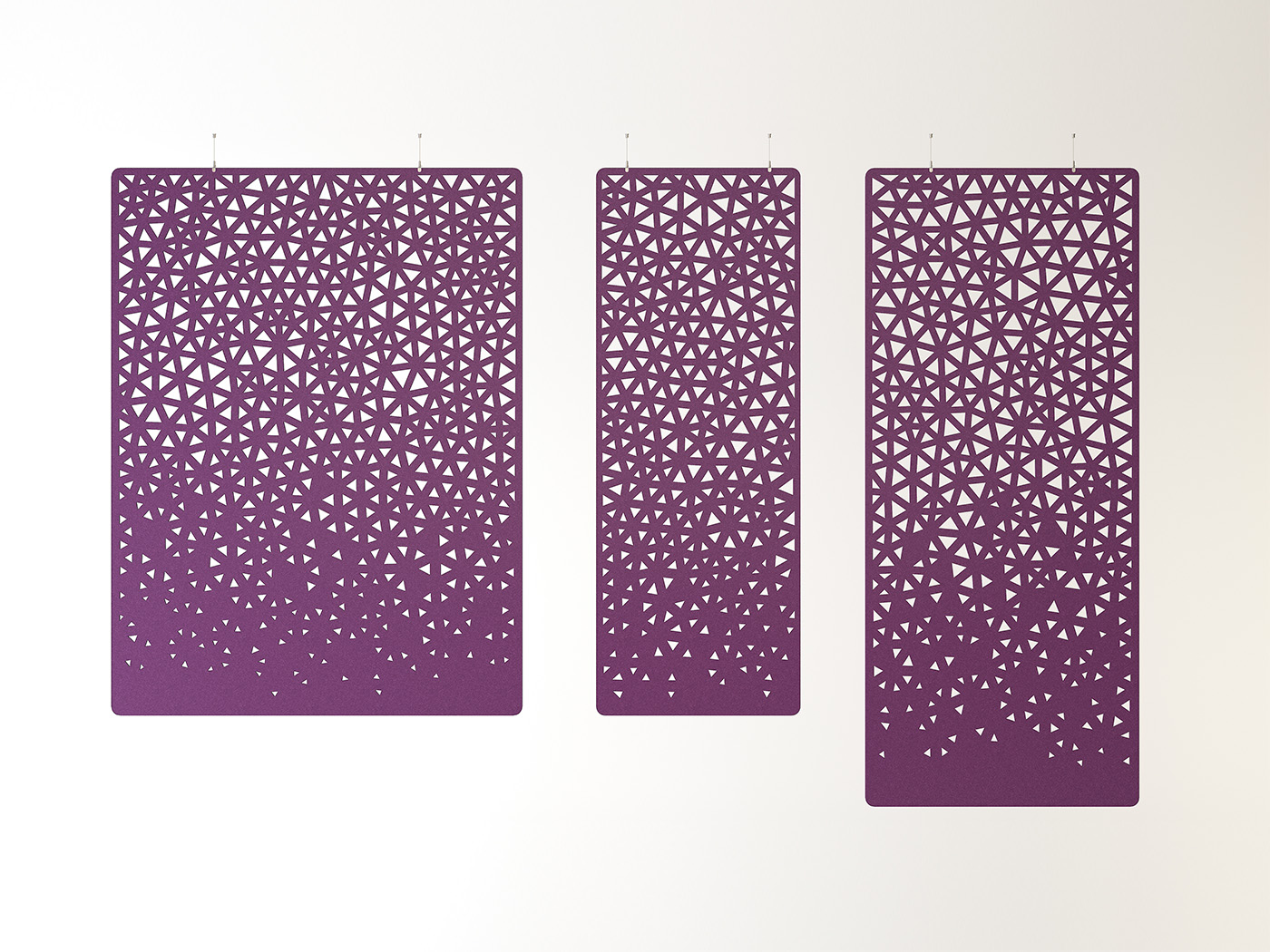 The harmonious distribution of the triangular perforations of this acoustic room divider is based on the Delaunay triangulation. Points are cross-linked to triangles so that no other points are contained within the circle on which the three triangle points lie (circumference of the triangle). This principle can be found everywhere in nature and has a calming effect on humans because it is subject to a clear rule.