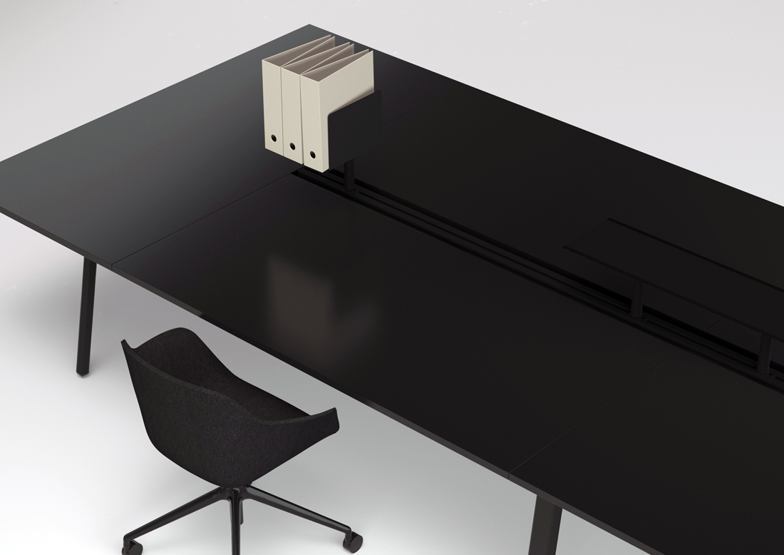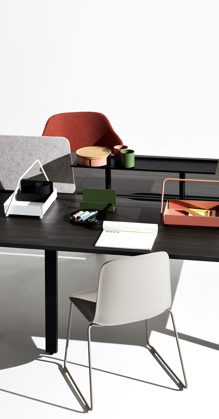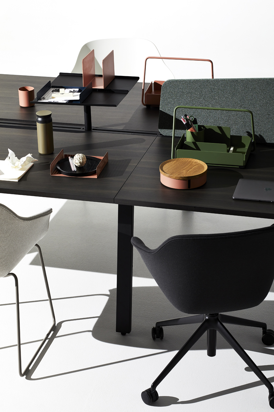 Work Shapes are a family of desk utilities made from textured powder coated aluminium and steel elements. Deriving size from a simple grid system, items nest, align, adapt and expand with ease across a workspace.