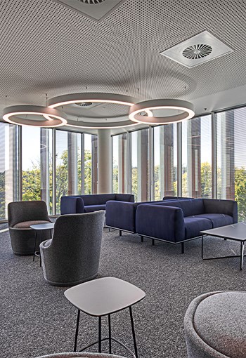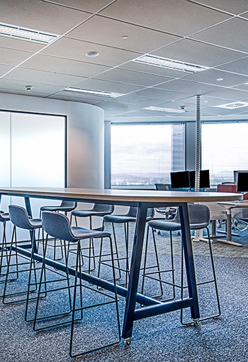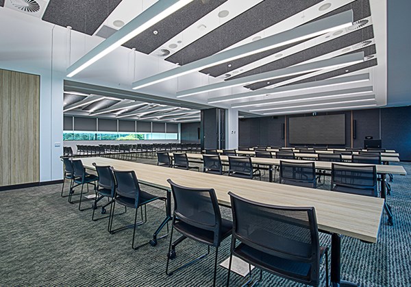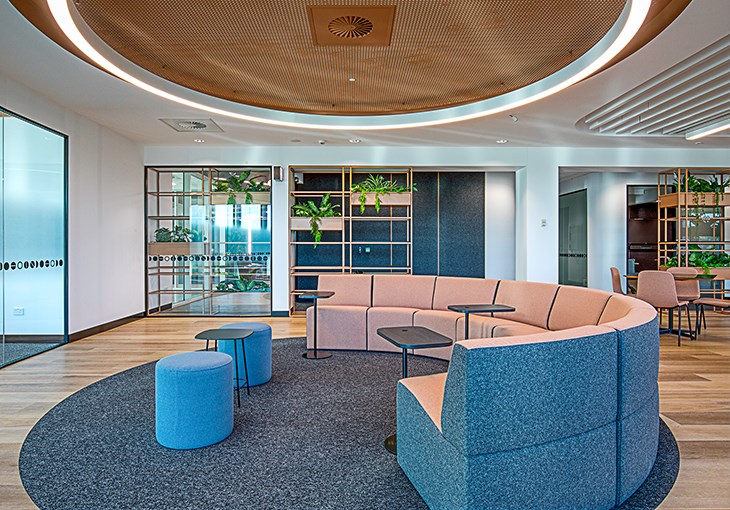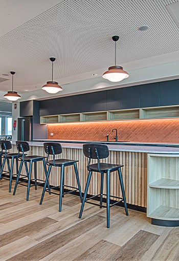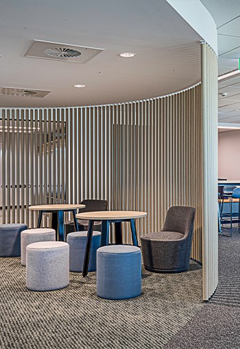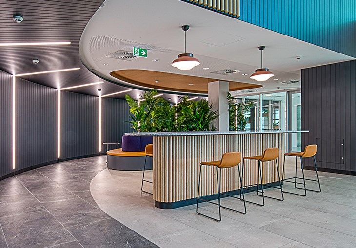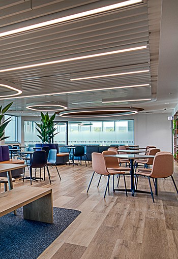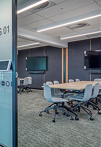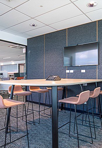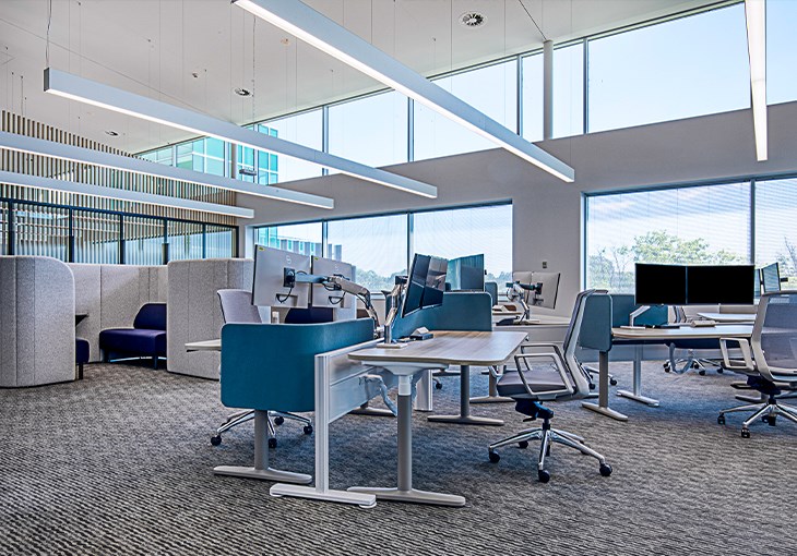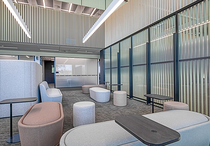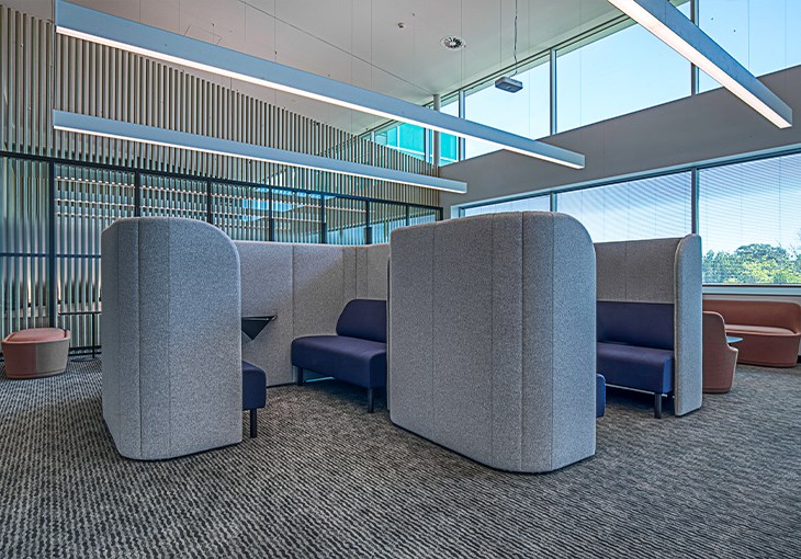 Considered spatial planning and early engagement of a specialist AV consultant were key to the success of this project to ensure a range of dedicated spaces were catered for over two levels. There's a Virtual Reality Room, an Augmented Reality Room, war gaming spaces, flight simulator and a “Makers Garage” in addition to highly flexible workspaces. A range of work modes are catered for, including Orbis workstations, booths, bench seating and the provision of a “coffice” (cafe / workspace) which provides for a relaxed breakout space as well as an extension to the open plan work area.